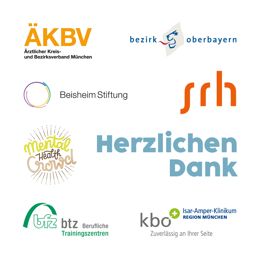 Unsere Unterstützer sind: das Gesundheitsreferat der Landeshauptstadt München, der ÄKBV, die Beisheim Stiftung, der Bezirk Oberbayern, die bfz btz Berufliche Trainingszentren, das kbo Isar-Amper-Klinikum Region München, die Mental Health Crowd, das SRH Berufliches Trainingszentrum München.