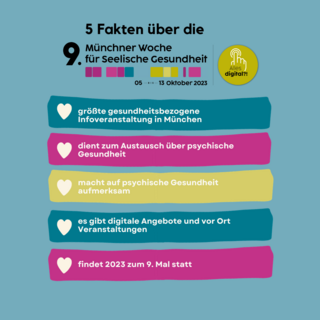Endspurt ist angesagt! Mit einem vielfältigen Programm schreitet unsere 9. Münchner Woche für Seelische Gesundheit langsam dem Ende entgegen. Nutzen Sie daher den heutigen Tag, um nochmal möglichst viele Veranstaltungen und Angebote mitzuerleben. Wir informieren Sie in diesem Newsletter über die anstehenden Programmpunkte und was es sonst noch im Rahmen der WSG zu entdecken gibt. Viel Freude beim Lesen!
